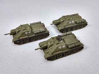 Some new Zvezda Su-122s - compared to the kit-bashed ones I made from the Axis & Allies miniatures game (back).